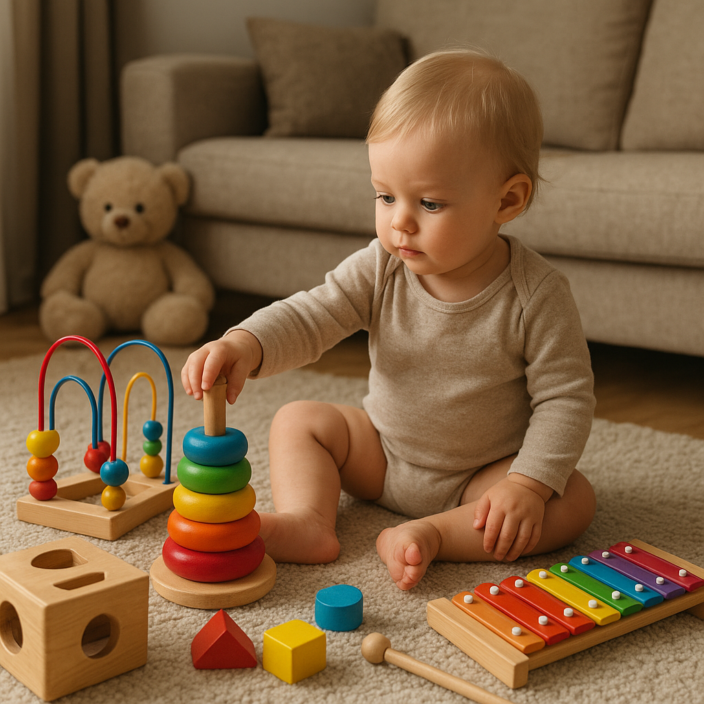 - Zabawki typu montessori – stymulują zmysły i zachęcają do samodzielnego działania.